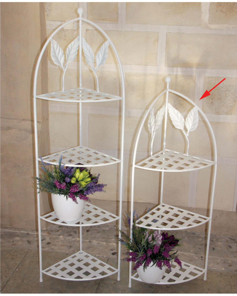 Angoliere in ferro battuto con disegno di foglie stilizzate, dimensioni lunghezza 32 cm, profondità 32 cm, altezza 114 cm, realizzato in Italia da Ceart. Elegante mobiletto dallo stile classico e raffinato, disponibile in cinque colori (seleziona il colore cliccando sui bollini che trovi sotto all'immagine). Angoliera in ferro battuto dallo stile romantico ed elegante, può essere usata sia all'interno che all'esterno, ottima per riporre ad esempio vasi oppure da utilizzare in bagno. Angoliera con tre comodi ripiani in ferro, molto solida e stabile.