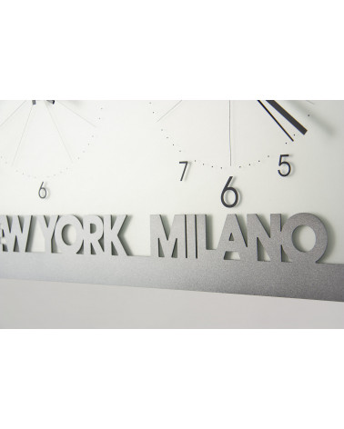 Orologio da parete modello "Fusi Orari", formato 70 x 32 cm, realizzato in Italia da Ceart. Moderno orologio che verifica l'attuale orario a New York, Milano e Tokyo, parte centrale con specchio sabbiato per migliorare la lettura del quadrante, disponibile in vari colori (nella foto in nero). Orologio al quarzo con batteria a stilo tipo AAA (non inclusa nella confezione).